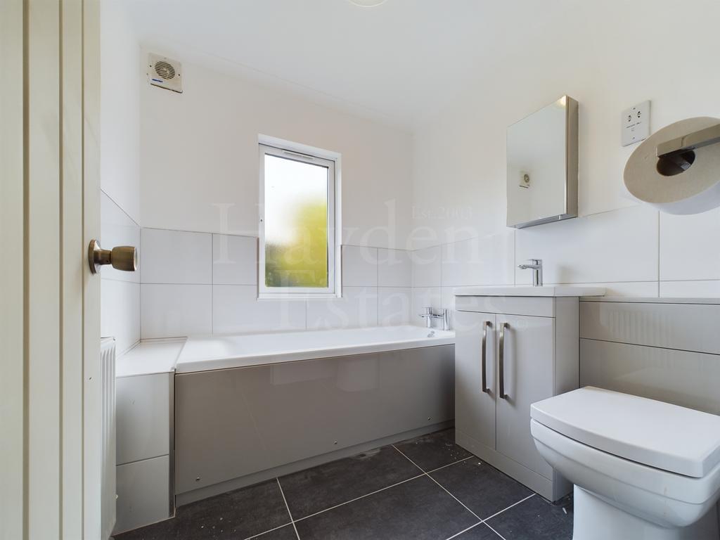 Side facing window, wall mounted extraction fan and shaver socket. Tiled effect laminate flooring. ceiling light point, panelled bath, vanity sink unit having mixer tap over and close couple wc suite. Partial tiling to the walls with radiator.