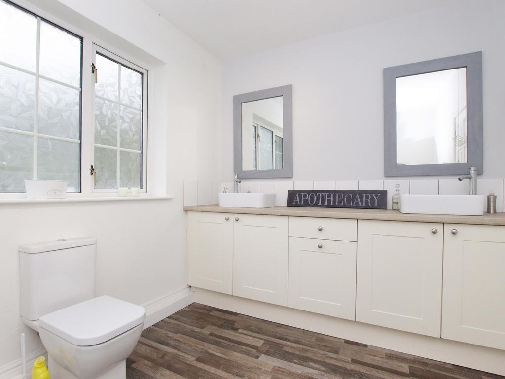 The first floor is completed by a spacious family bathroom, featuring cushioned laminate-effect flooring, a vanity unit with his-and-her sinks, and a conveniently located large linen cupboard.