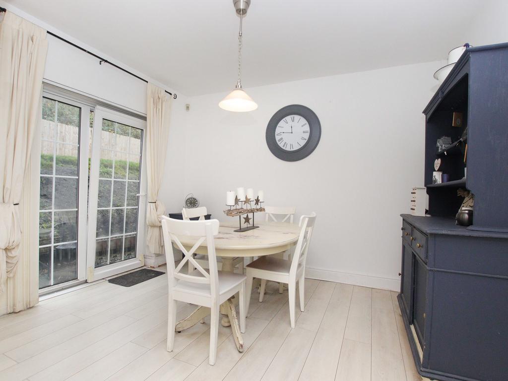 At the rear of the property lies the spacious kitchen and dining area, both with laminate flooring. The kitchen boasts ample storage, an integrated oven, hob, and extractor hood, while an archway seamlessly connects it to the dining area, which features patio doors leading directly to the rear garden—ideal for indoor-outdoor entertaining.