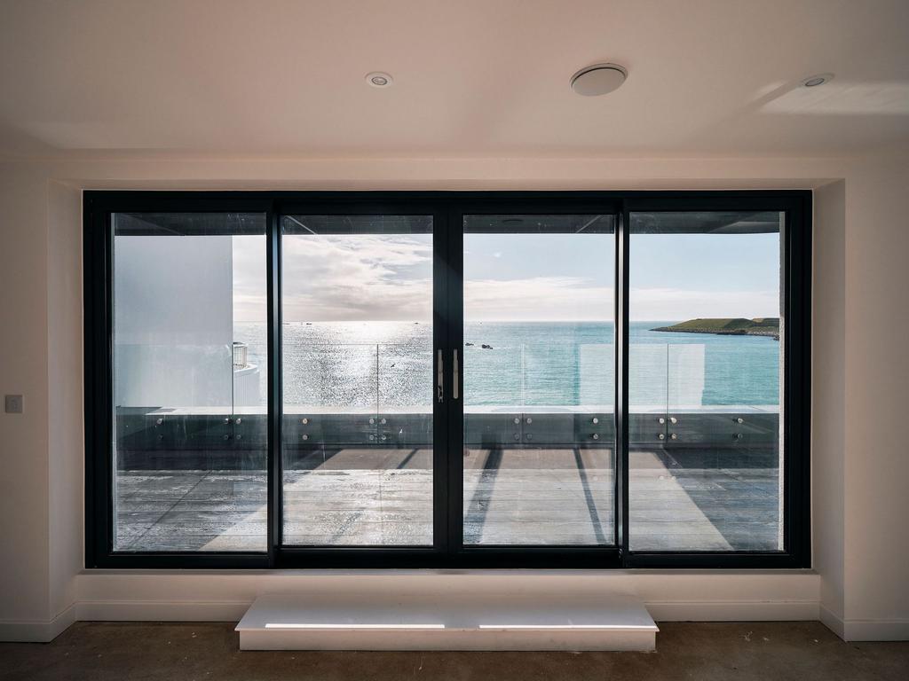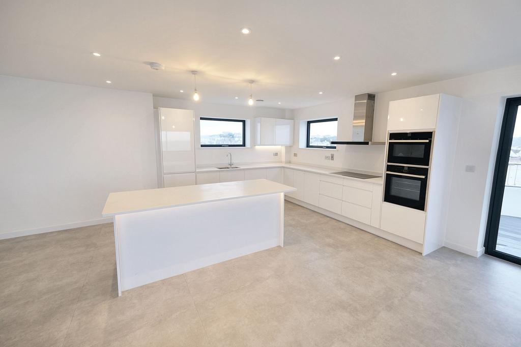 The elegant open-plan living and dining space is perfectly designed for modern coastal living, seamlessly incorporating a fully fitted, high-quality English Rose kitchen, finished to an exacting standard. Floor-to-ceiling glazing frames the spectacular outlook and provides direct access to the south-facing balconies, creating an effortless connection between interior comfort and outdoor relaxation.