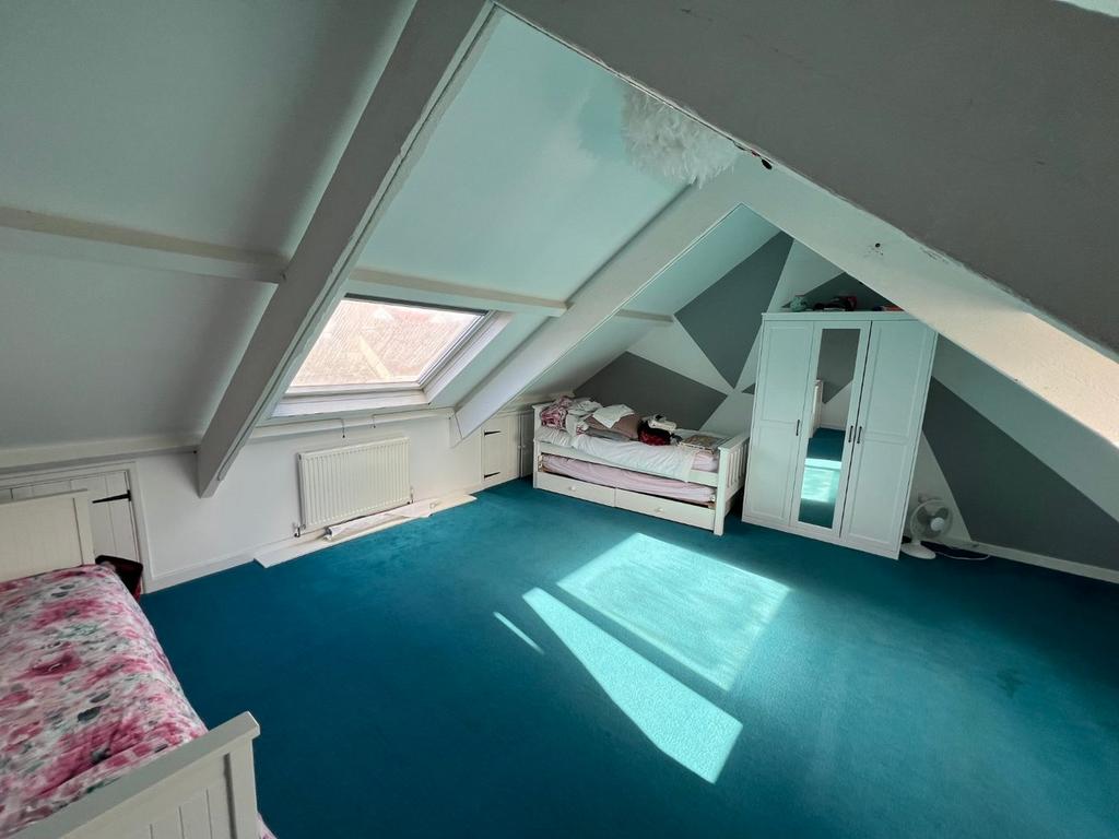 18' 2" x 17' 4" (5.54m x 5.28m) with 9'4" maximum headroom with sloping ceilings and exposed beams. Dormer window to rear overlooking park and sports fields with velux window to the front with a glimpse of the sea. 2 central heating radiators. Access to under eaves.