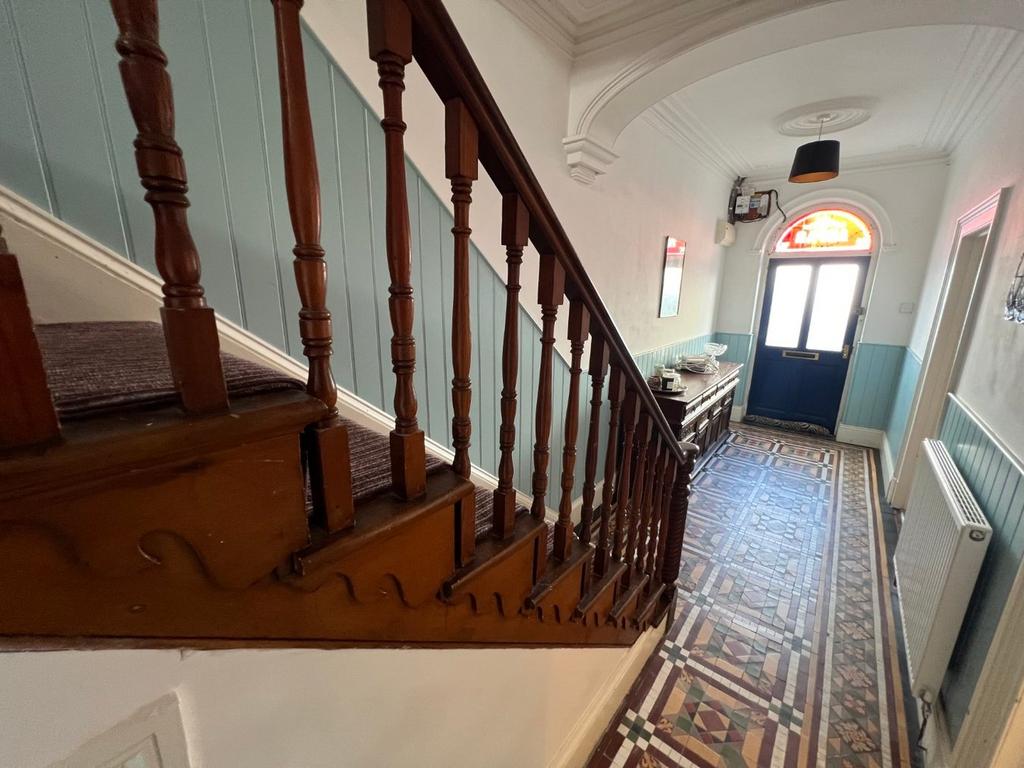 With half glazed entrance door with attractive stained glass fan light over, original ceiling cornices and covings, panelling to dado level, mosaic tiled floor, central heating radiator, understairs storage cupboard.