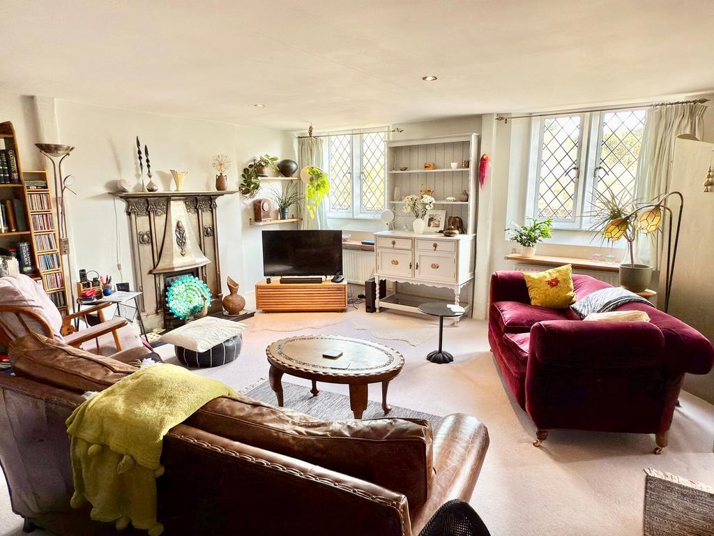 The entrance hall welcomes visitors and has an attractive old brick flooring and leads into the open plan living room with its beautiful leaded light stone mullion windows and an Art Deco style fire surround with gas flame effect fire, all creating a characterful atmospheric, yet modern space.