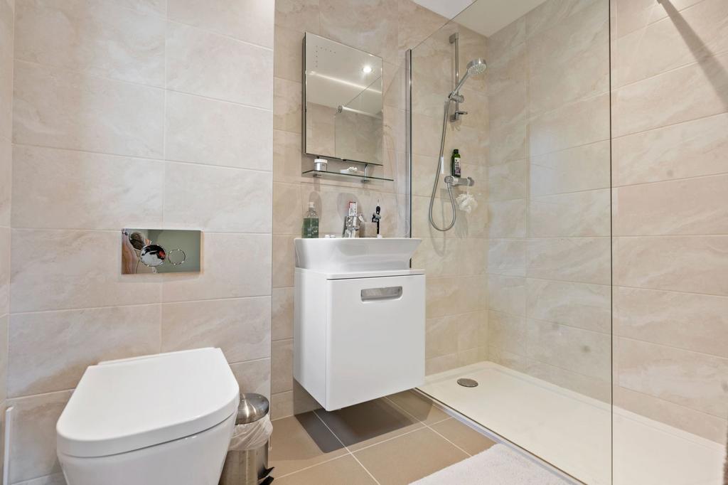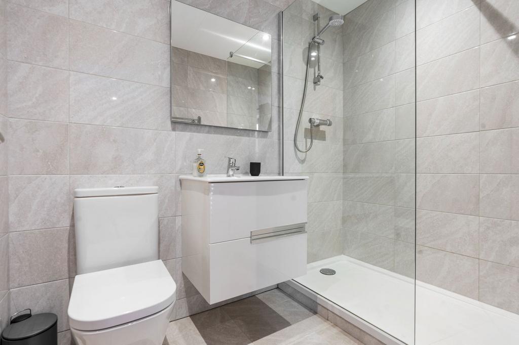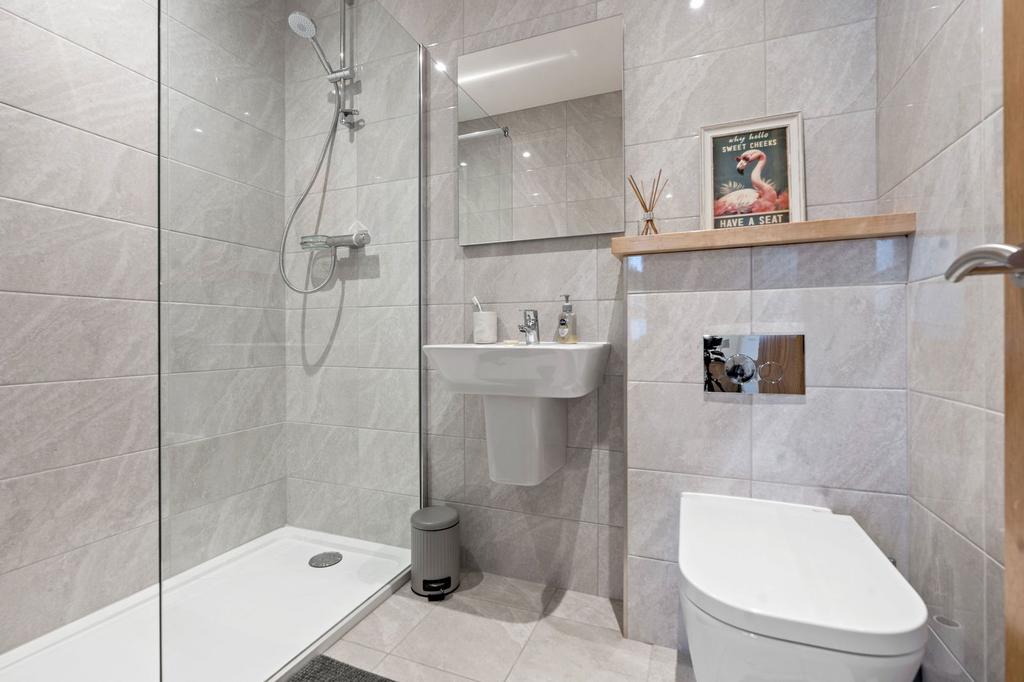 Fully tiled with attractive tiled floor and walls, large walk-in shower enclosure with Mira thermostatic shower, concealed cistern Roca W.C., wall hanging sink, extractor fan.