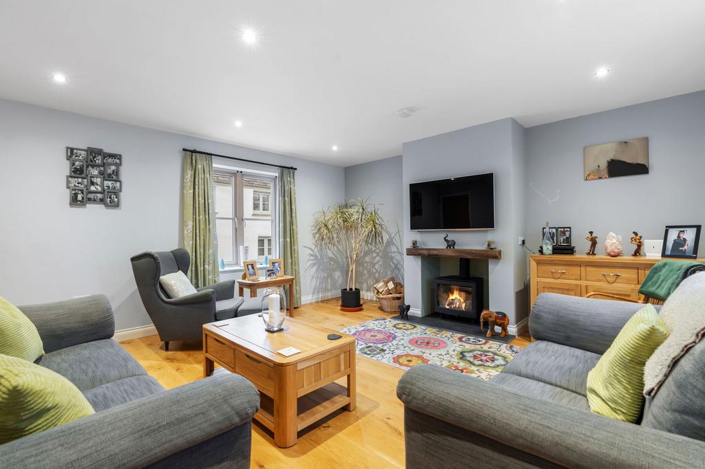 A lovely feature dual aspect room with oak flooring, woodburning stove on slate hearth. Door to
