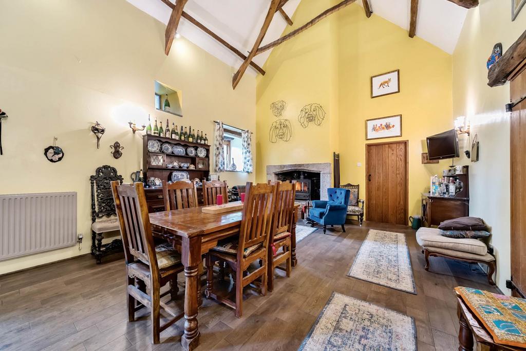 A most impressive reception room having the main features of this room as a granite fireplace with a cast iron multi-fuel burner set on a slate hearth and the original A framed vaulted exposed beamed ceiling. Oak double glazed window with deep slate sill, central oak stair case rising to the first floor minstrel landing. Radiators, wooden oak framed double glazed French doors giving access to the formal garden. Two sets of Cathedral shaped doors give access into the Dining Room edged in period beams, oak floor.