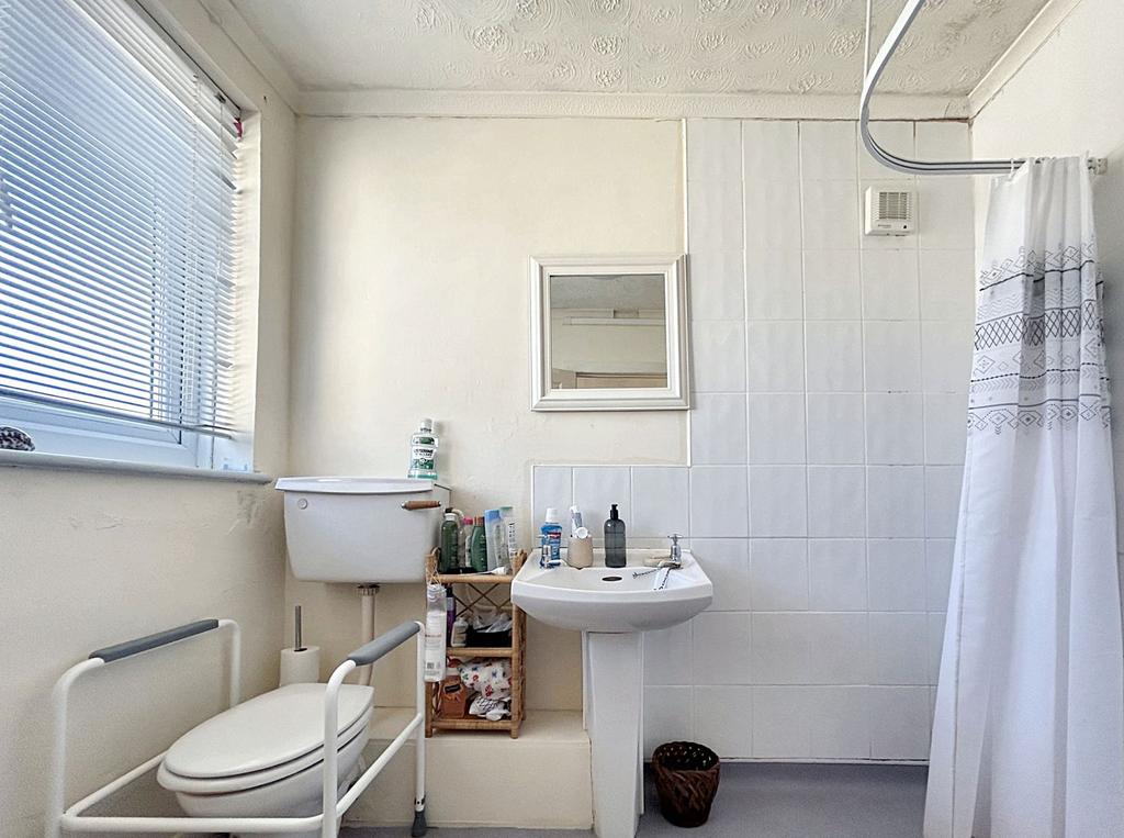 With double glazed window, wet room flooring, tiled walls, mains shower, w/c, and pedestal wash hand basin and central heating radiator.