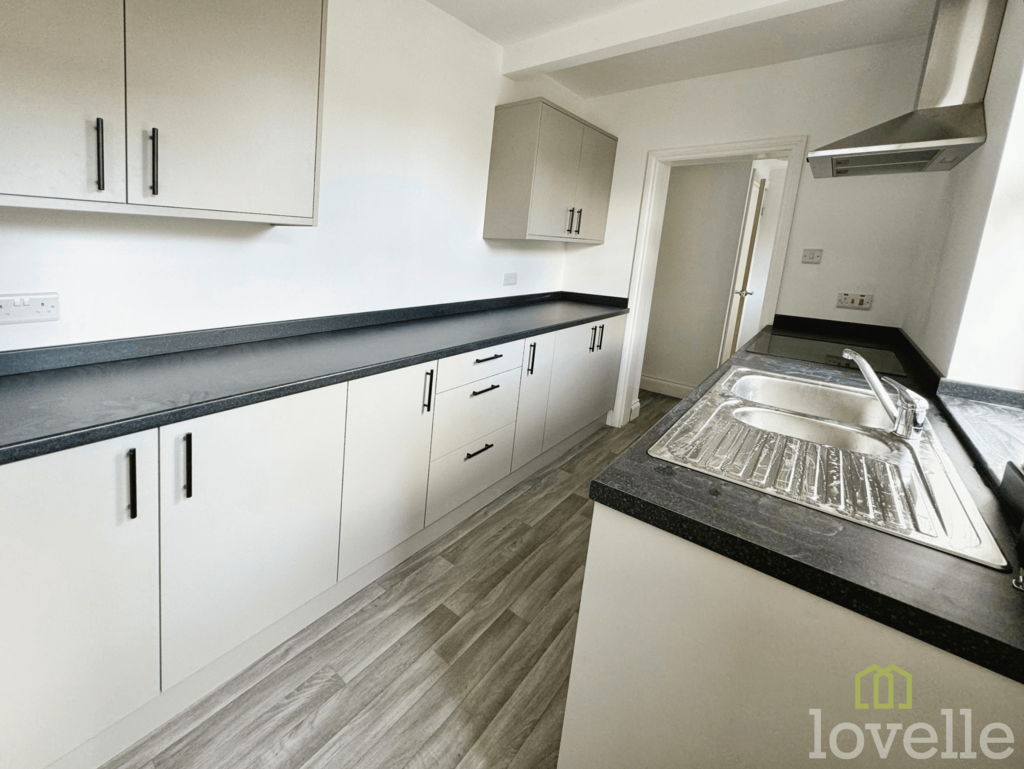 Fitted kitchen comprising of; wall and base units, 1 1/2 stainless steel sink and drainer with mixer tap, electric oven with induction hob and overhead extractor, radiator, vinyl flooring, opening to utility room and door to rear.