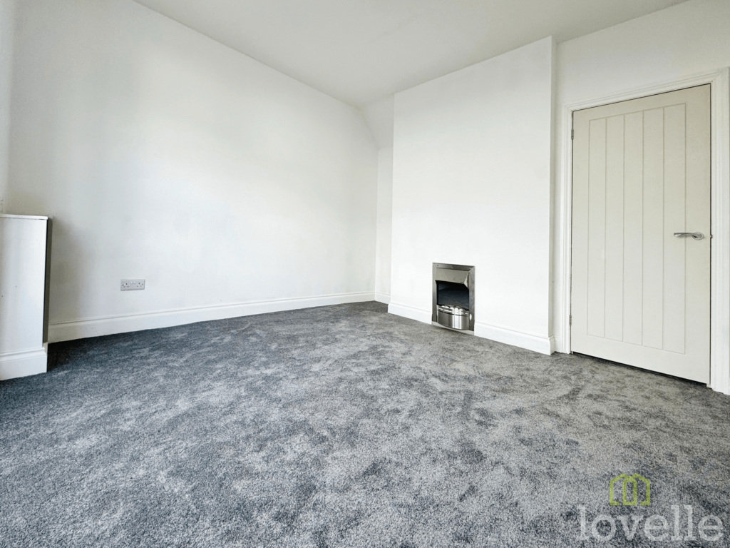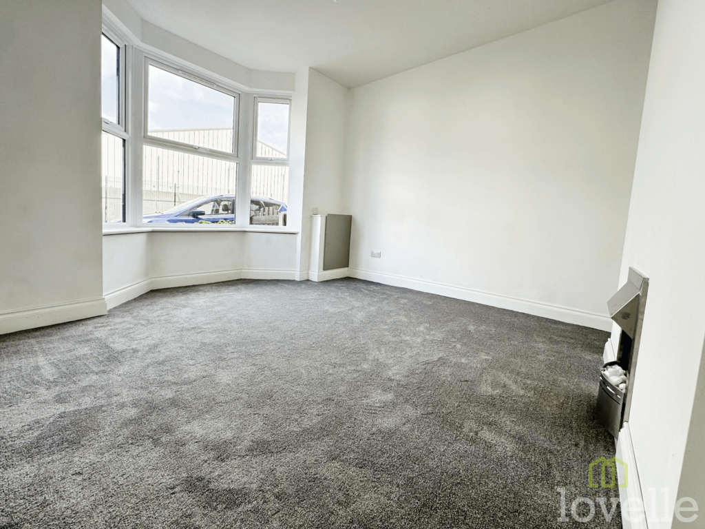 Bay window to the front aspect, electric fire, cupboard housing meters, radiator and fitted carpet.