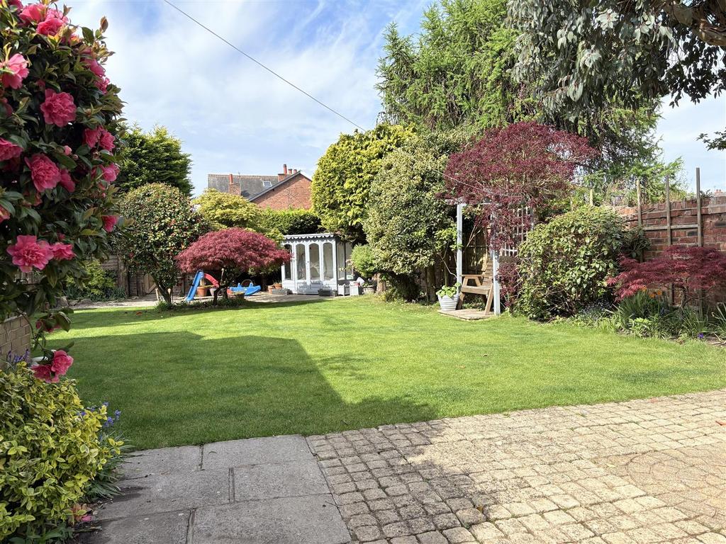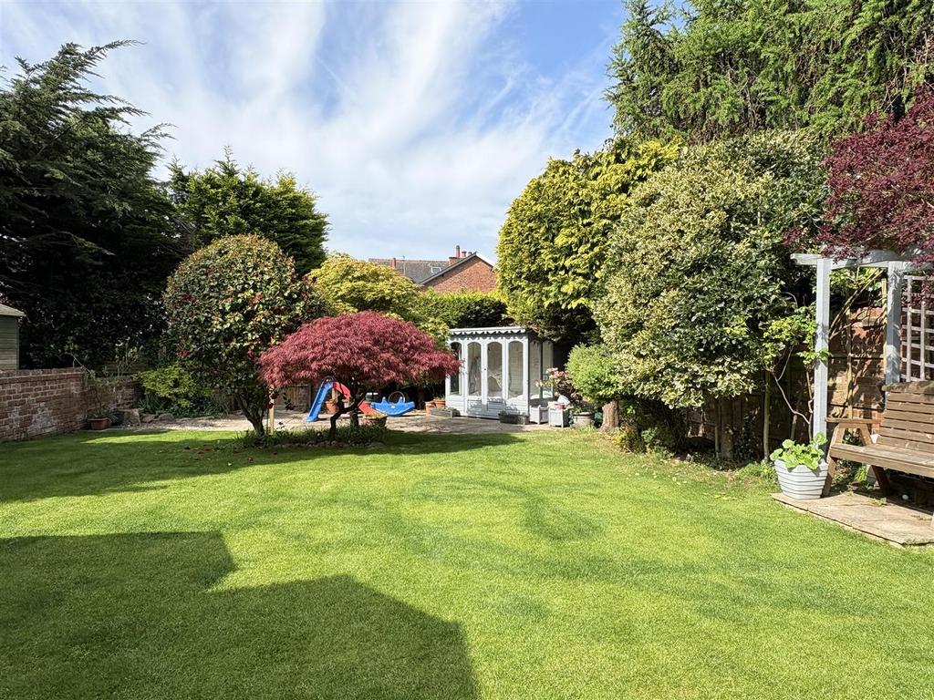 To the immediate rear is a superb family walled garden, enjoying a sunny West facing aspect. A stone flagged sun terrace adjoins the rear of the house with a decorative stone inset and external lighting. Timber trellis to the side of the Garage with mature climbing flowering plants. Timber garden store. Large lawn beyond with a second rear stone flagged patio area with attractive side landscaping with stone chippings and inset shrubs, conifers and trees. Timber framed summer house. Timber gate gives access to the rear shared service road.