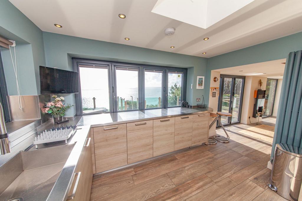 The bespoke dual aspect kitchen is a wonderful size offering superb range of drawers, cupboards and wall mounted cupboards with stainless steel work surfaces. Built-in Smeg 4 ring halogen hob, extractor, large oven and Siemens dishwasher with space for a large American style fridge/freezer. Sink unit and Bi-folding windows overlooking the rear gardens and stunning sea views.