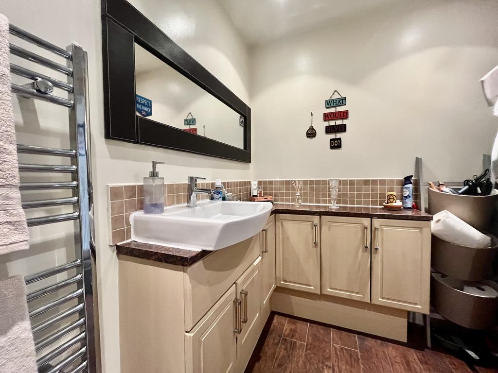 Three piece white sanitary suite, window to rear, Karndean flooring, heated towel rail, recess lighting and power shower over bath with glass screen.