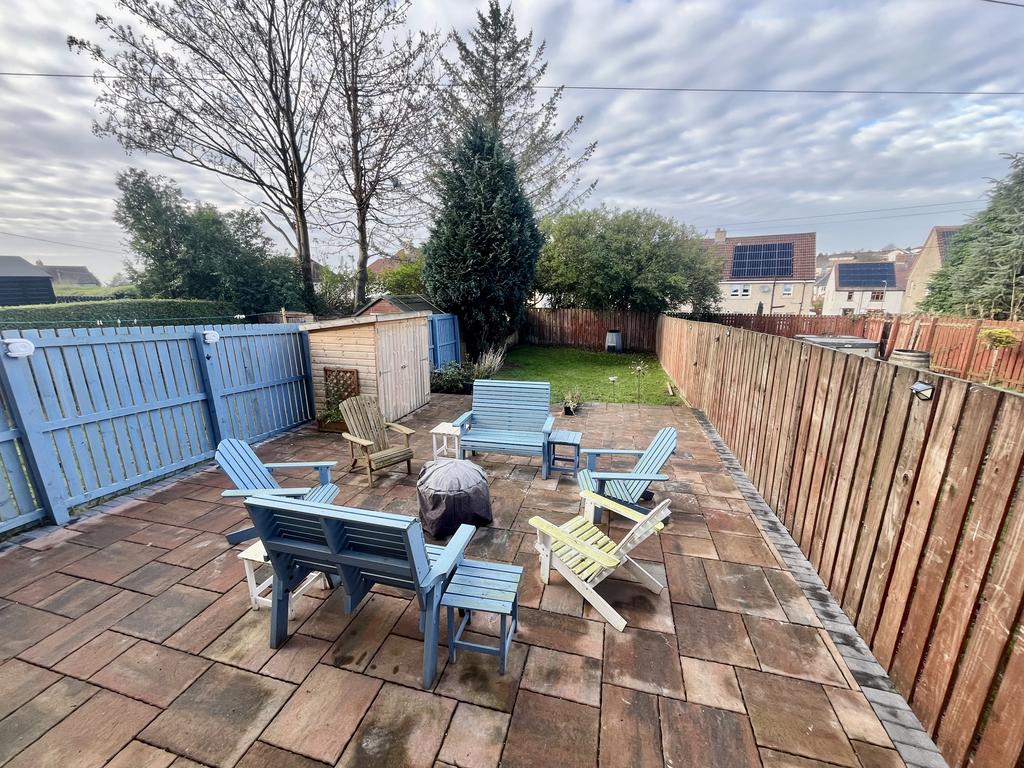 Rear garden is mainly laid to lawn with shrubs and trees, paved patio area and shed.