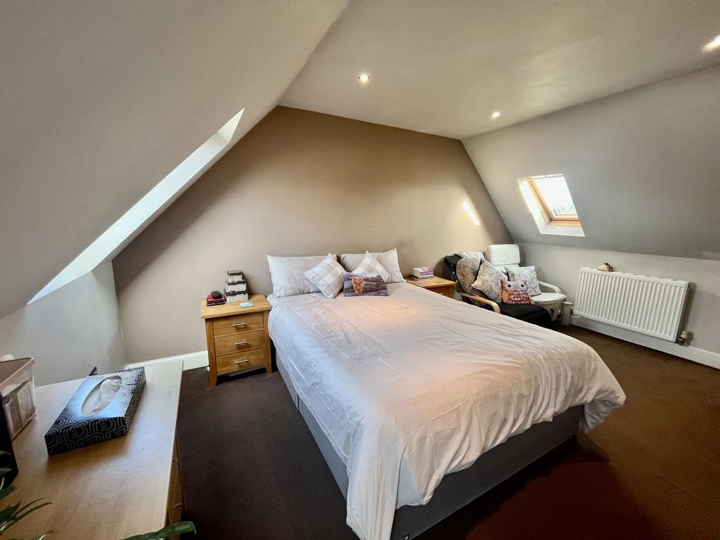 Carpeted flooring, recess lighting, 3 vellux windows, storage cupboard and access to upper hallway.