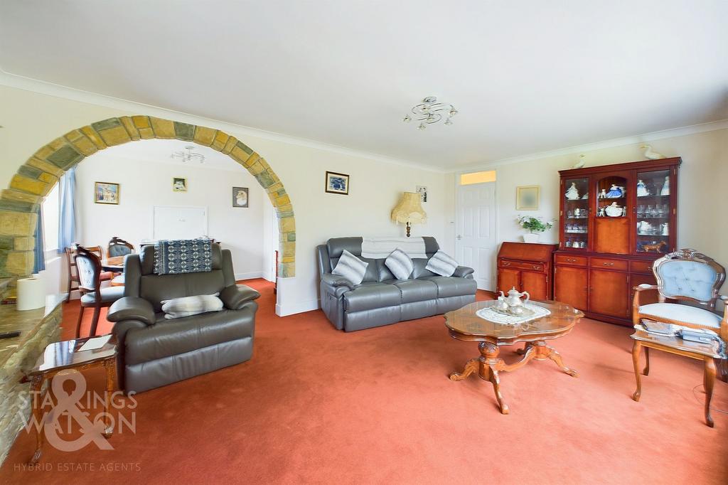 The sweeping 'in out' driveway provides plenty of driveway parking for multiple vehicles and leads to the double garage. To the front of the property there is a large laid to lawn area with various mature planted trees and hedges, as well as raised pond with stone surround, and access to the rear garden to the side of the bungalow. The main entrance door can be found to the front with a small porch.
