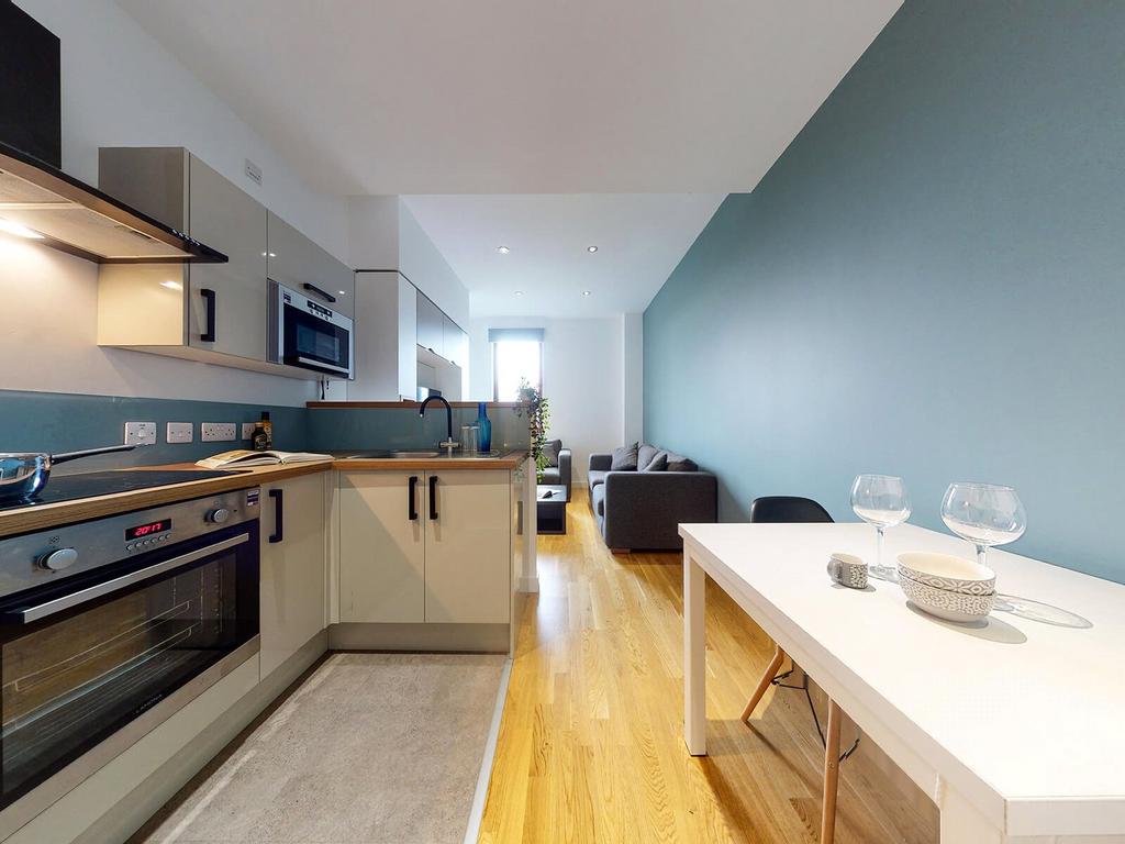 Your open-plan kitchen doubles as a dining and living area, equipped with essential appliances, a large comfy sofa, coffee table, dining table, and smart TV – the ultimate social hub for connecting with friends and family. And to top it off, say farewell to communal laundry services as you'll have your very own washer-dryer for added convenience.