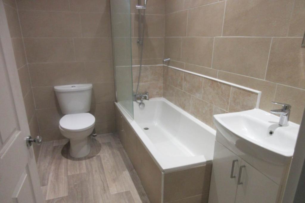 Comprising panelled bath with mixer tap and shower attachment with glass shower door, vanity unit with inset wash hand basin and low-level w.c. Travertine tiled walls and floor. Chrome ladder style radiator.