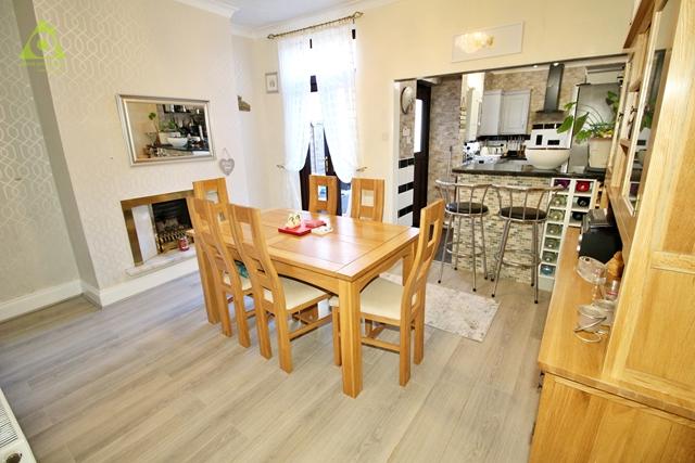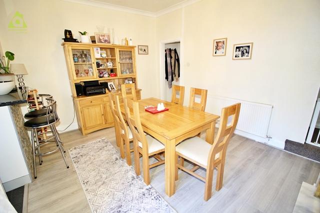 The dining room has been tastefully decorated and benefits from a gas fire with brass surround, central heating radiator, power points, uPVC French doors giving access to the rear garden, coving, grey laminate flooring, a central ceiling light, open plan access to the kitchen, an understairs storage cupboard and an opening leading to a central staircase which elevates to the first floor accommodation.
