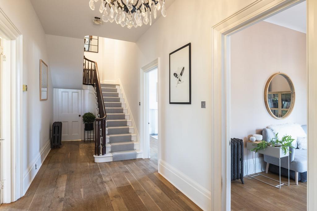 The impressive, pillared portico and entrance door open to a traditional hall with timber floors, a grand staircase, and a feature chandelier. The sitting room boasts four tall sash windows that capture day-long light, offering views over the verdant southern garden. Also on the ground floor are two further reception rooms—each with French doors opening to a decorative balcony with far-reaching views over the garden to the agricultural land beyond. Stairs lead down to a half-landing with a study/office and an adjacent cloakroom. The basement level offers a large 30'3" x 12'8" family kitchen/dining room with hand-painted Chalon kitchen furniture, an AGA, and a stable door leading directly to the garden/parking area. Flexibility continues with additional spaces currently used as a home gym, playroom, and utility area, in addition to a shower room—conveniently located for pool access.