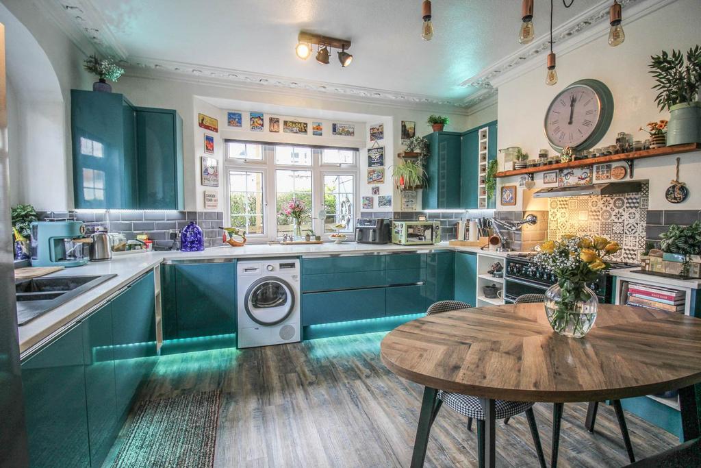 Dual aspect uPVC double-glazed windows. High level ornate coved ceiling with two light points. Fitted in 2021 with an extensive range of turquoise eye and base level units with granite worktop surface over. Inset 1½ bowl sink with extendable mixer tap. Space for Range cooker with extractor over. Newly integrated Neff washing machine and dishwasher. Space for tumble dryer. Kick board lighting. Space and plumbing for American-style fridge freezer. Cast iron radiator.