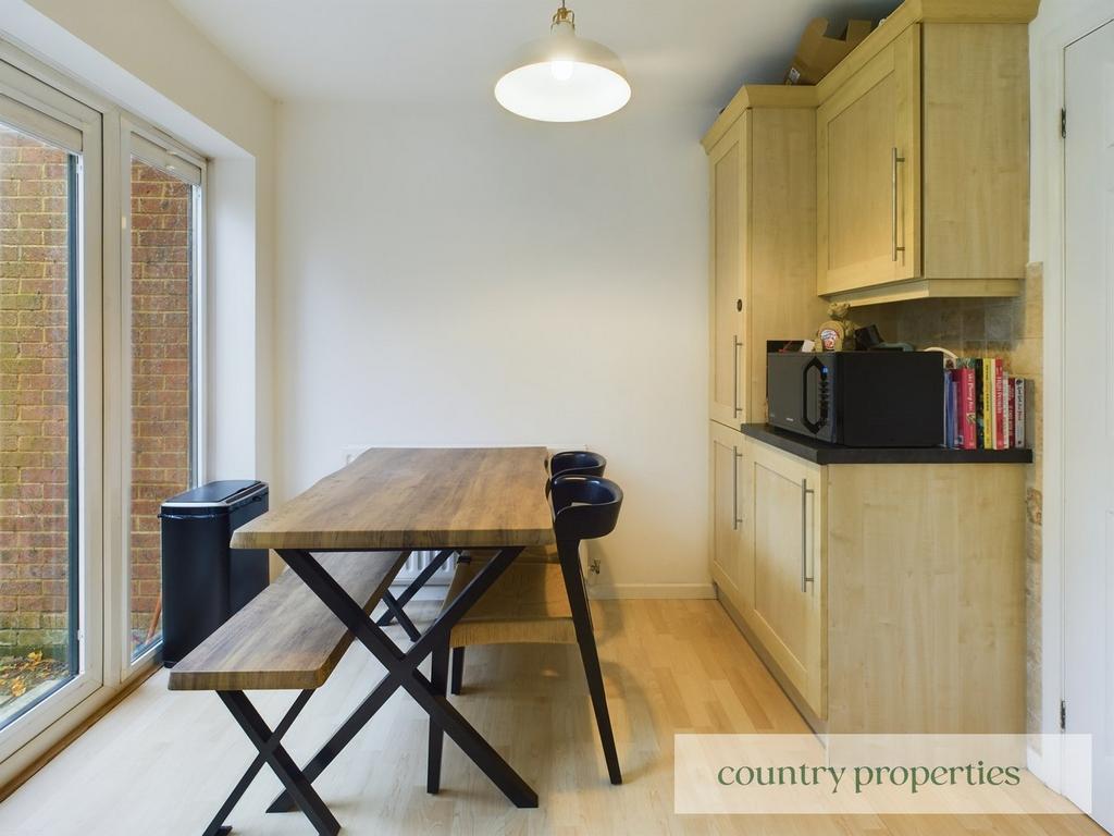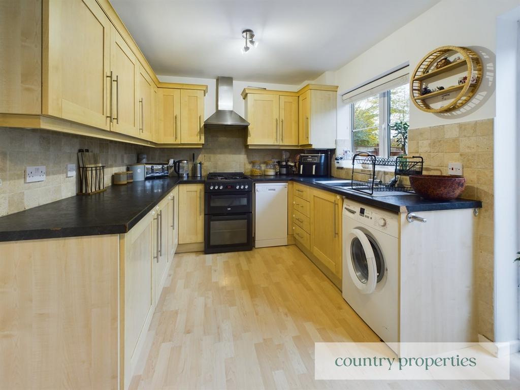 Continuation of the laminate flooring. Dark laminated roll edge worktop with 1 ½ bowl stainless steel sink unit within with mixer tap over. Space and plumbing for automatic washing machine, Space and plumbing for slim line dishwasher, space for gas Cooker with stainless steel chimney style extractor over. Beach effect fronted cupboards with brushed steel bar style handles. Room for breakfast table and chairs. Radiator, Ceramic wall tiling to splash back area. Replacement UPVC double glazed door with full height windows either side and integrated blinds, a further replacement UPVC double glazed window to rear.