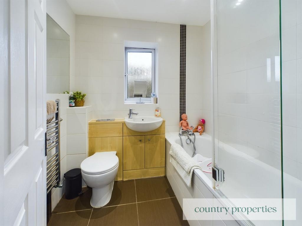 Refitted white bathroom suite comprising of an enamelled panel bath with mixer tap and shower attachment and further thermostatically controlled handheld shower over. Low level dual flush WC with a concealed system. Wash hand basin with mixer tap inset within a vanity cupboard below, wall mounted Chrome effect heated towel rail, ceramic wall tiling with integrated Large mirror, ceramic floor tiles.. Sunken ceiling downlighters, replacement UPVC double glazed window to rear with obscured glass.