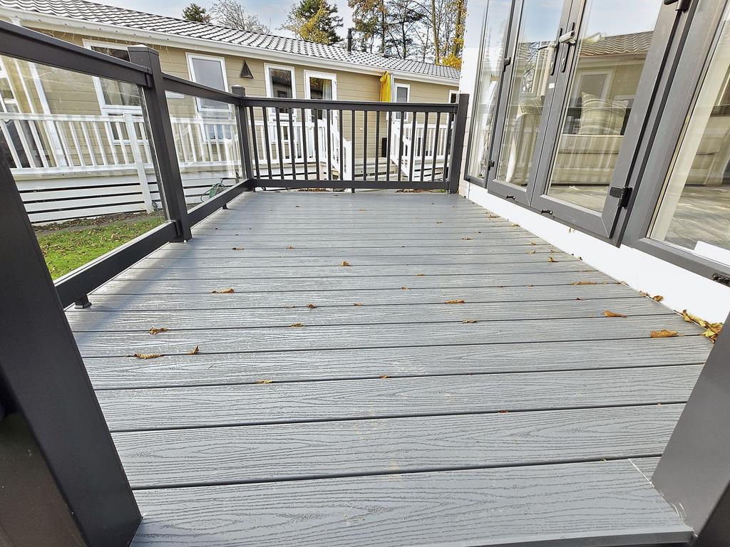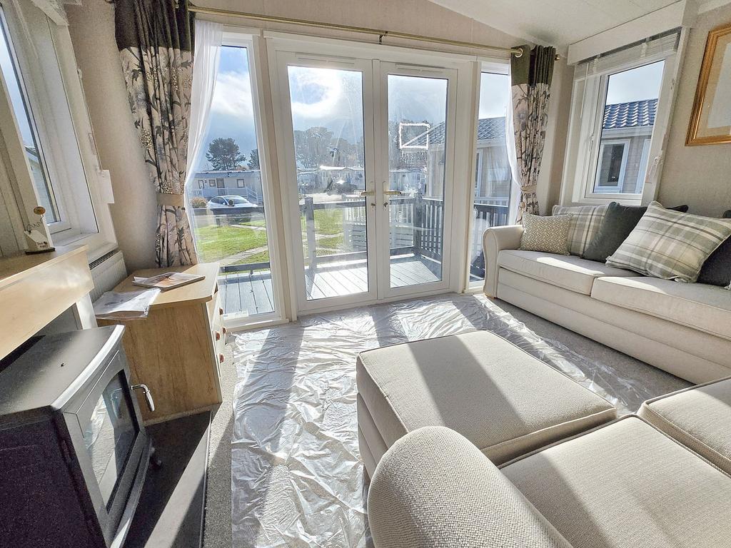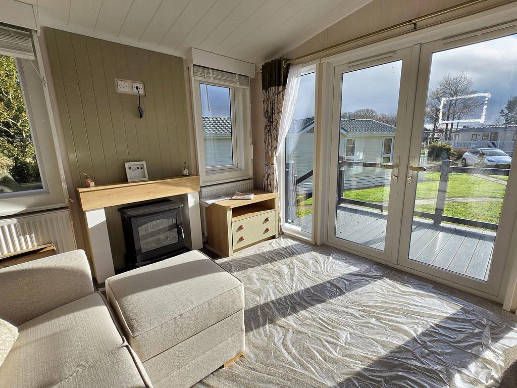 Double glazed windows to three sides, two radiators, feature fireplace with inset electric fire, double glazed French doors to the decking.