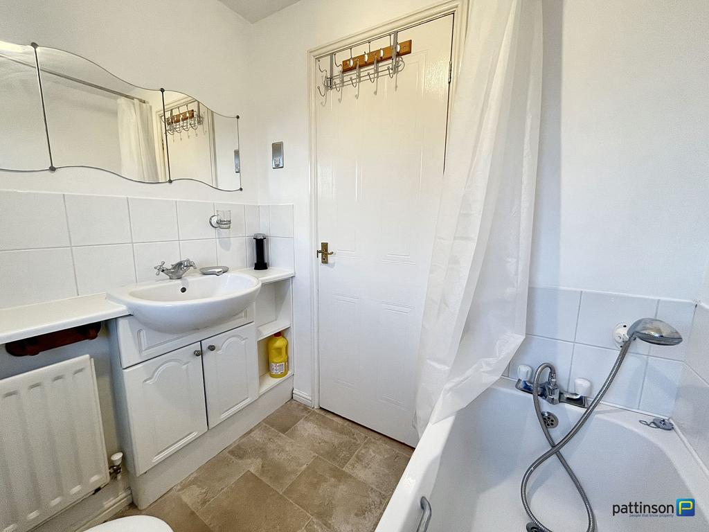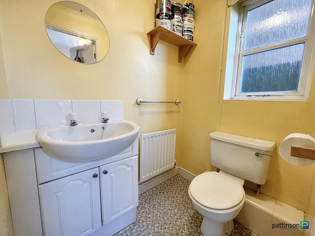Vinyl floor covering, painted plastered walls, central heating radiator and double-glazed window to side aspect. Close-couple W/C, hand wash basin on vanity unit with tiled splash back.