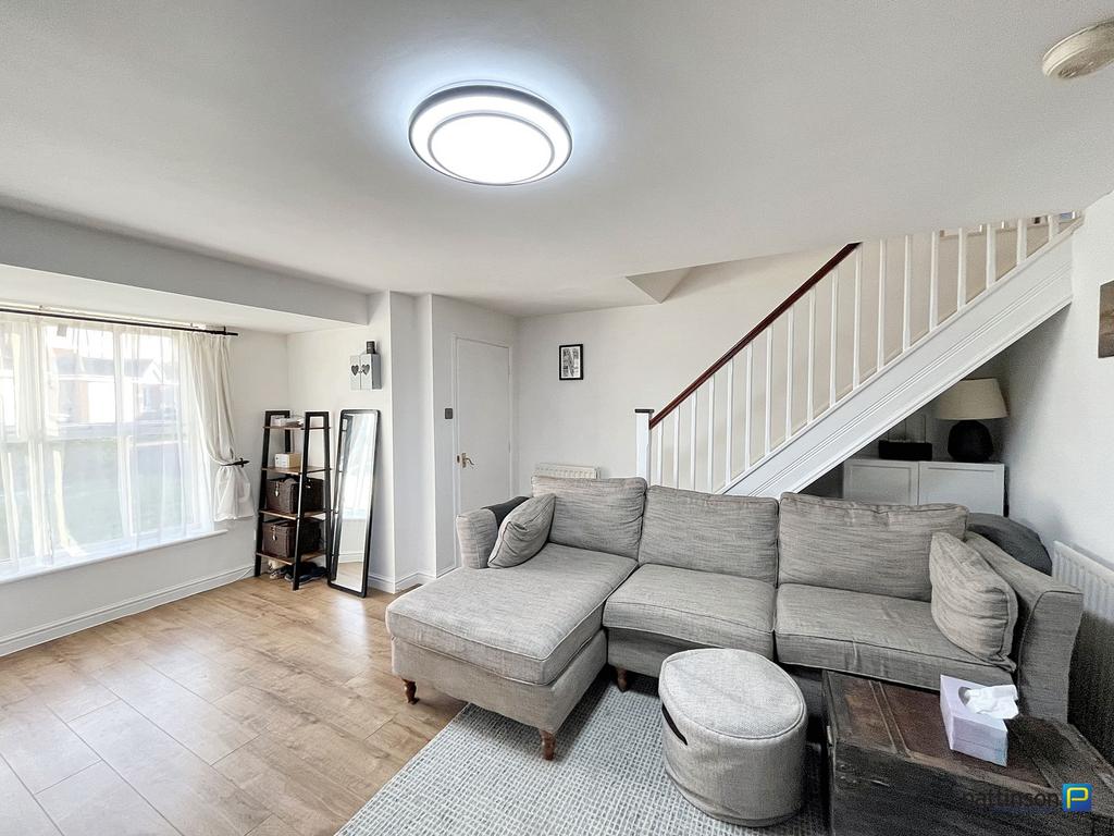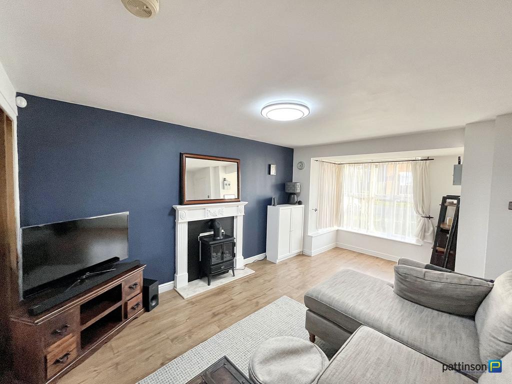 Engineered wooden floor covering, painted plastered walls with decorative fire surround complete with electric stove. Open staircase to first floor, double-glazed bay window to the front aspect and part-glazed solid Oak double doors to kitchen / diner. Central heating radiator and open under stair storage.