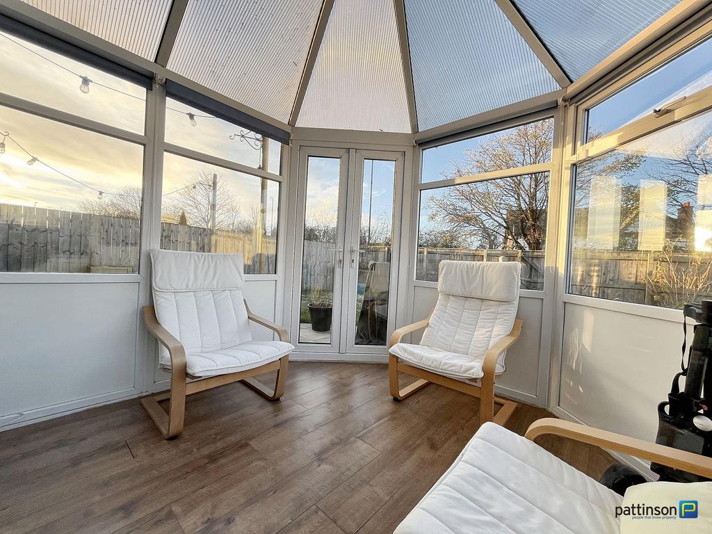 Engineered wooden floor covering, uPVC double glazed with patio doors onto rear garden. Lighting and electrical socket. Ideally positioned to catch the evening sun with ample space for seating and furnishings.