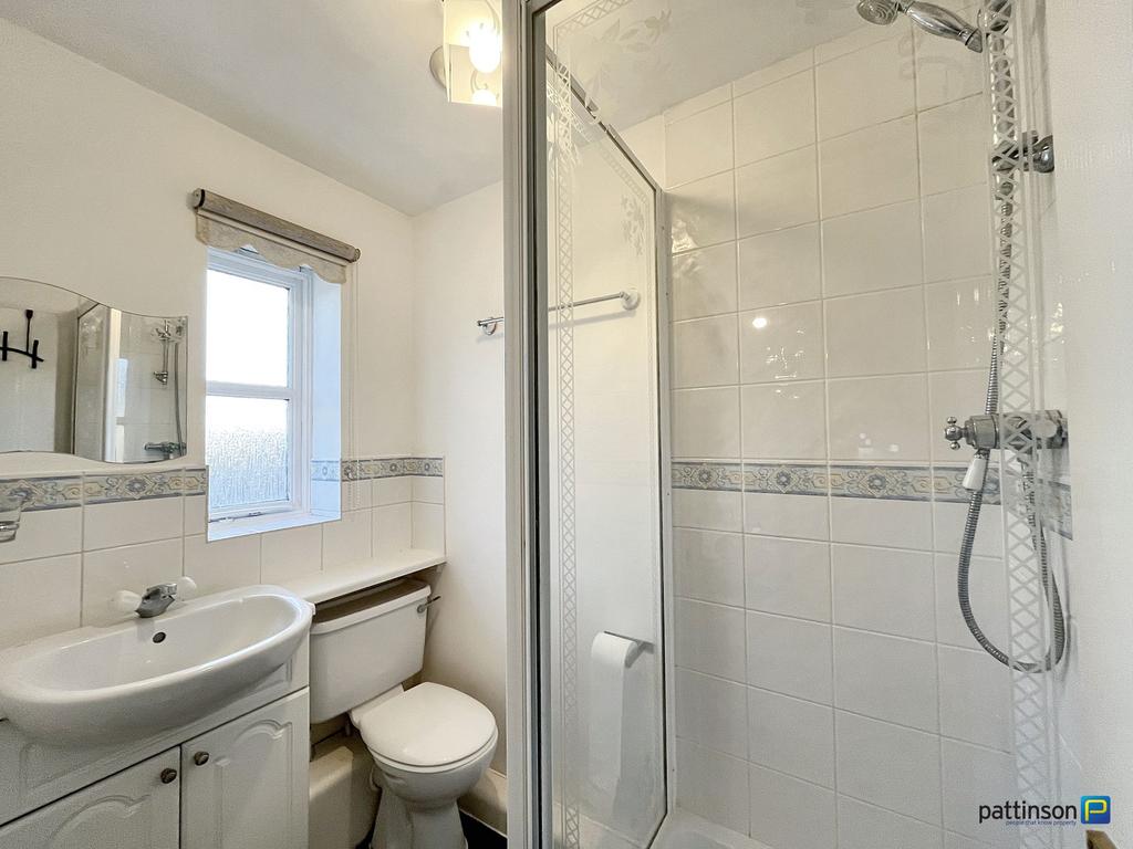 Vinyl floor covering, part painted plastered, part tiled walls, central heating radiator and double-glazed window to the front aspect. Close-couple W/C, hand wash basin with mixer tap on vanity unit. Square shower cubicle with tiled walls and mains water overhead shower.