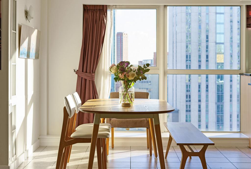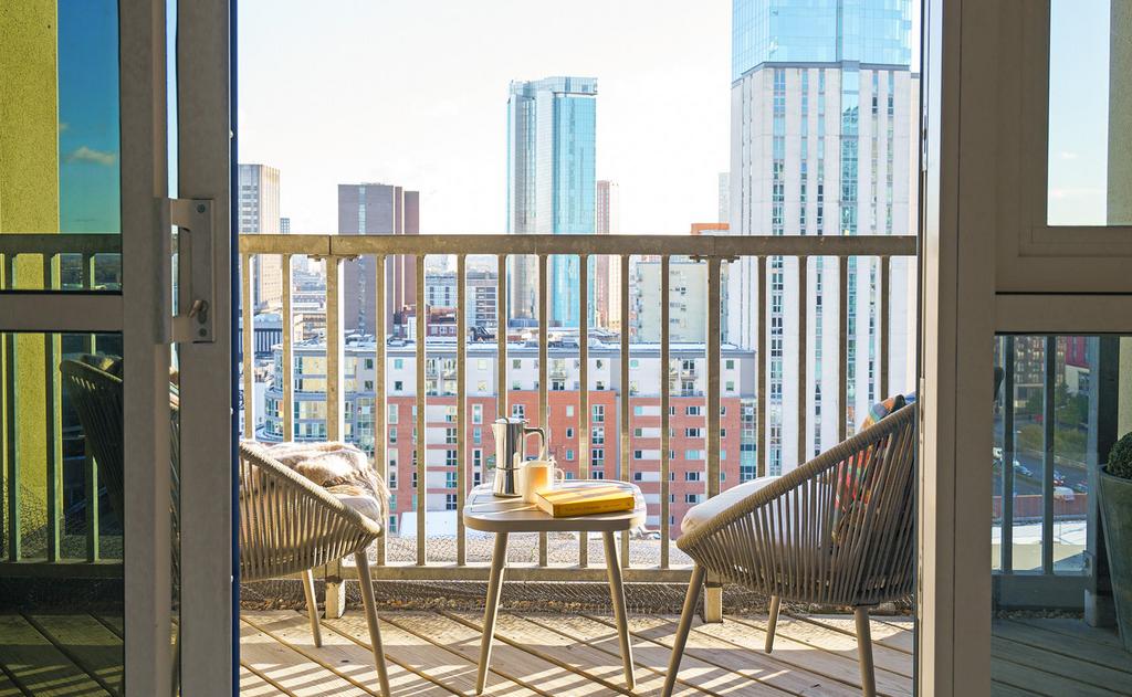 A private balcony extends from the living area—an idyllic relaxing spot while the bustling cityscape unfolds beneath you.