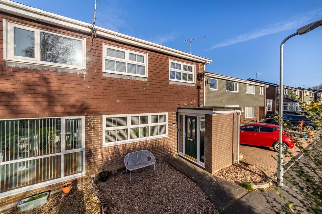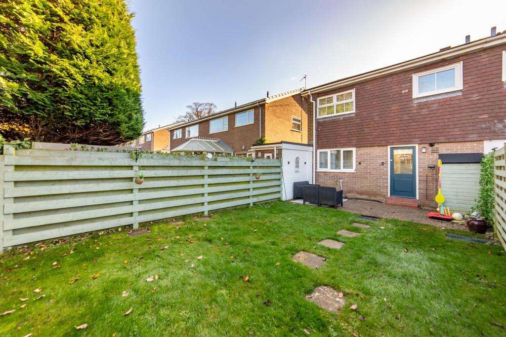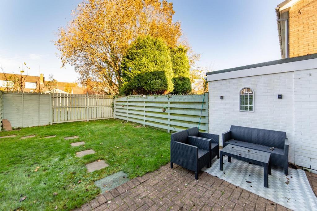 Externally, the property offers a tidy front garden with gravel and potted shrubs, while the expansive rear garden features a lawn, a paved seating area, and a storage shed. Additionally, a garage is conveniently located a short distance away on the estate.