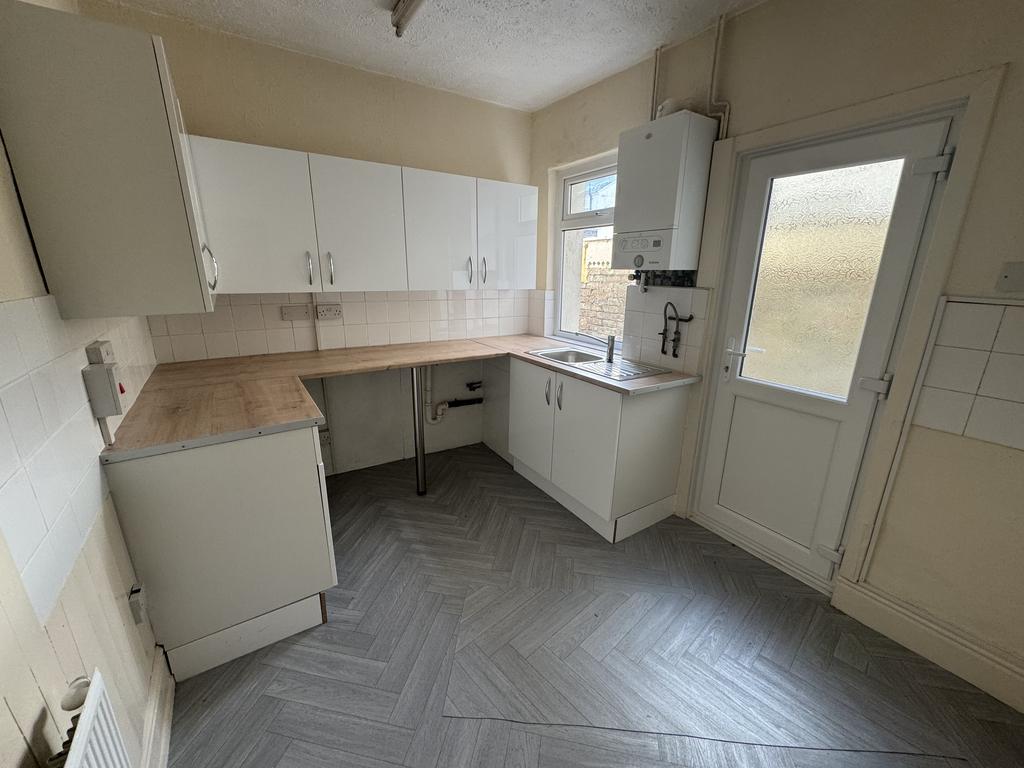 Kitchen. 3.20m x 2.50m, UPVC Double glazed window and door to side, gas central heated radiator, range of wall and base units, stainless steel sink unit, plumbing for washing machine.