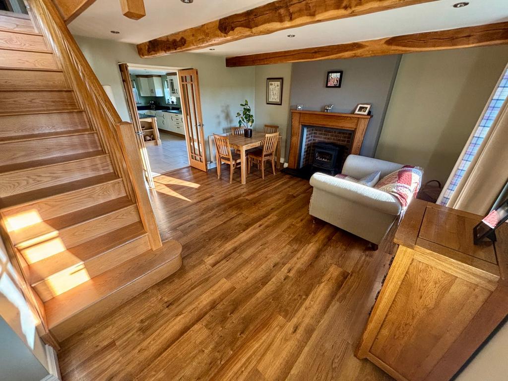 15' 1" x 13' 9" (4.60m x 4.19m). With an impressive open brick fireplace housing a cast iron multi fuel stove on a slate hearth, oak staircase to the first floor accommodation, Karndean wood effect flooring, oak beams, oak window sills, spot lighting.