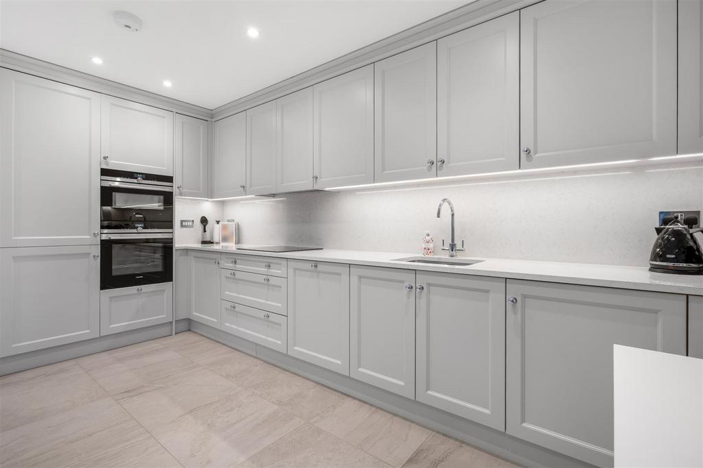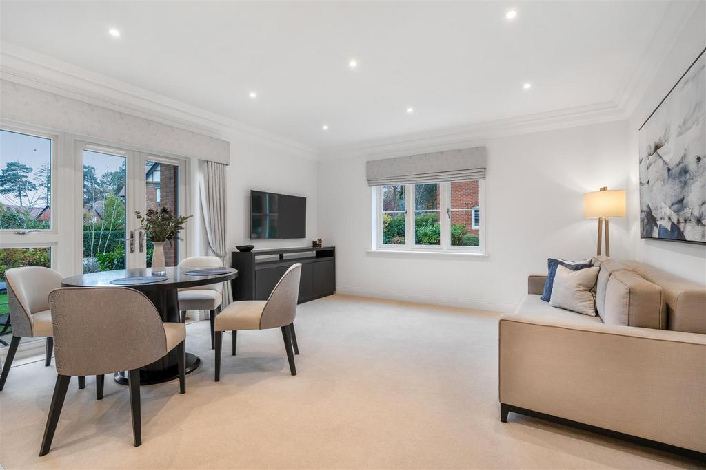 This ground floor apartment has a principal bedroom with built-in wardrobes and en suite, a second double bedroom, bathroom and an open-plan kitchen, living and dining room with double doors leading out to patio.