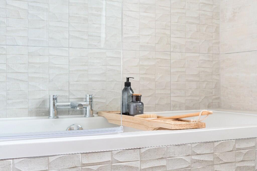 Full height tiling to shower enclosures, backsplash tiling to wet areas. Chrome thermostatic towel radiators. Chrome taps and shower.