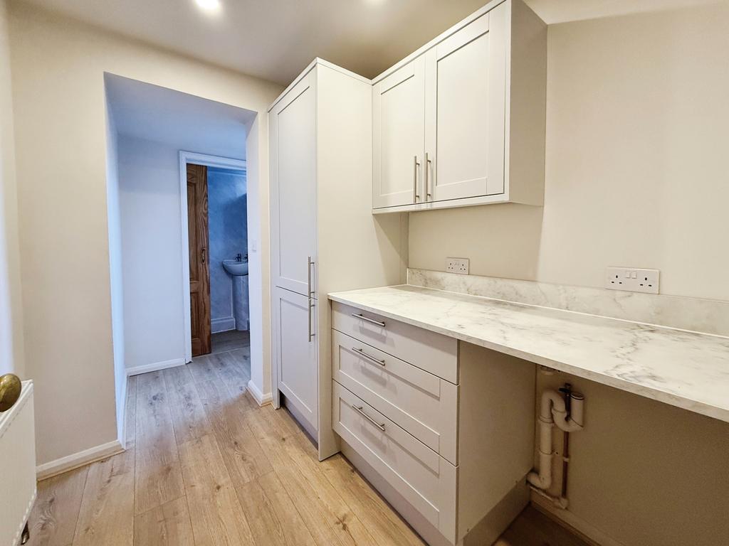 Fitted wall and base units, space for washing machine and doors to rear garden and cloakroom.