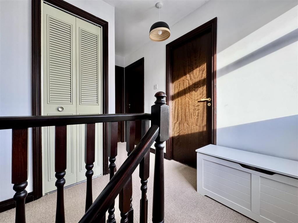 First Floor Landing - Stairs ascend to the first floor landing with a side window offering rooftop views, a hatch gives access to a part boarded loft and doors lead through to four bedrooms (one with ensuite shower room), family bathroom and a storage cupboard housing the water cylinder.
