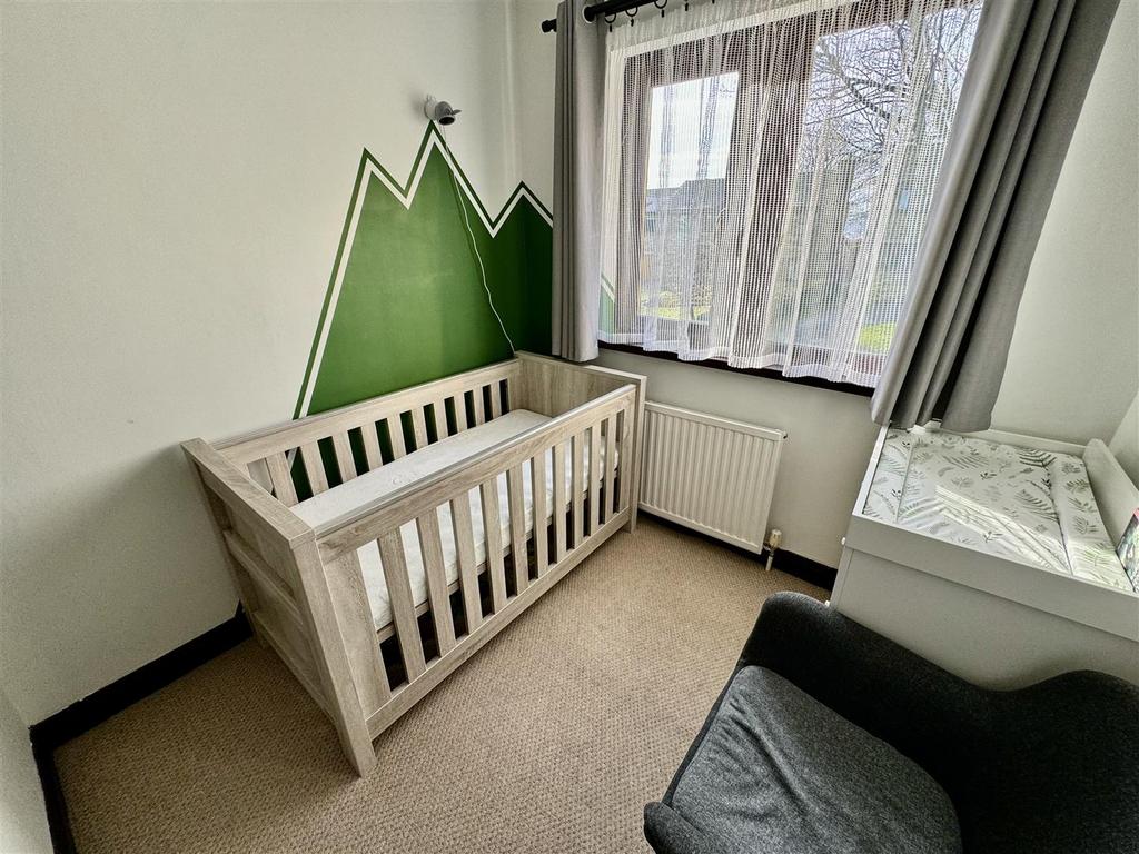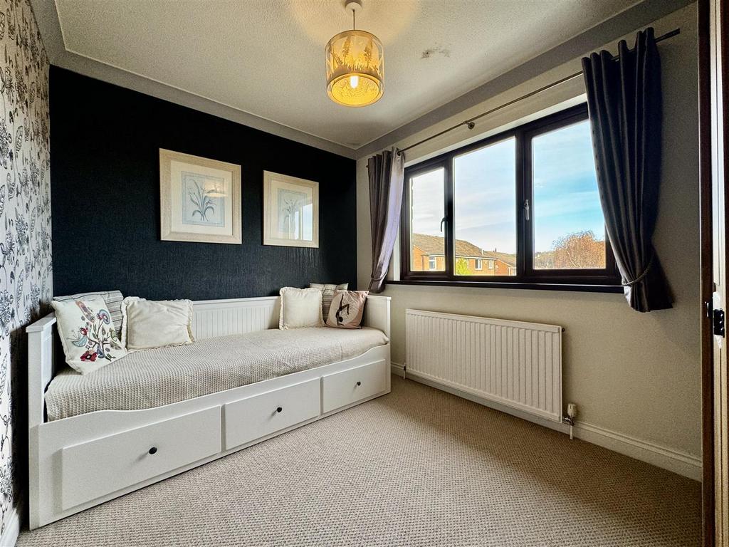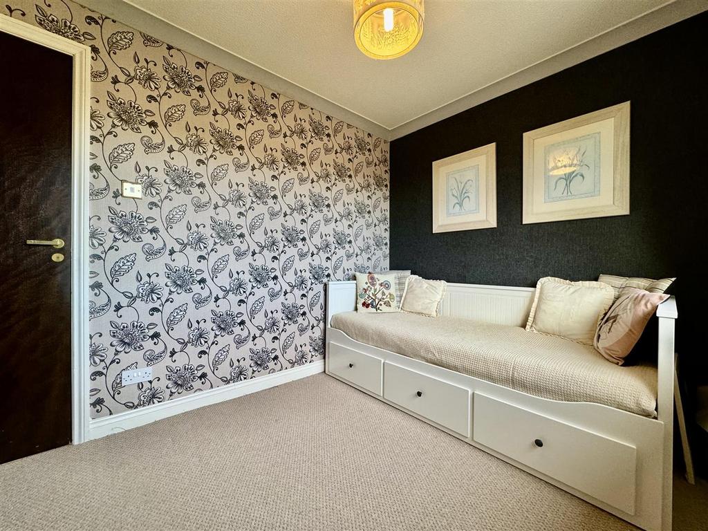 Bedroom Four - Currently used as a child's nursery, this bright single bedroom has pleasant views over the cul de sac below, space for freestanding furniture and bulk head shelving. A door leads through to the landing.