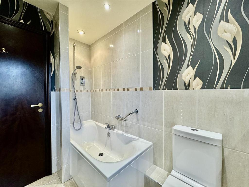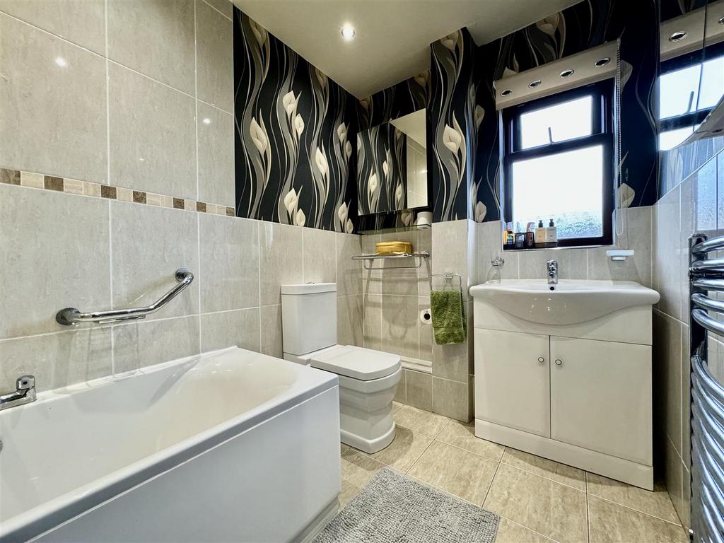 Bathroom - This stylish bathroom is fitted with a white three-piece suite, including a bath with shower over, vanity hand wash basin with mixer tap and a low level W.C. The room is partially tiled with complimentary tile flooring underfoot, has a chrome towel radiator and spotlighting to the ceiling. A side obscure window allows light to flow through and a door leads through to the landing.