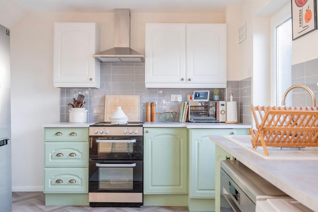 This inviting living area is perfect for both relaxing and entertaining. The stylish kitchen continues the herringbone flooring, offering ample storage and workspace with a range of base and wall units. It also features space for essential appliances and a dedicated dining area. A single door leads directly to the rear garden, ideal for dining.