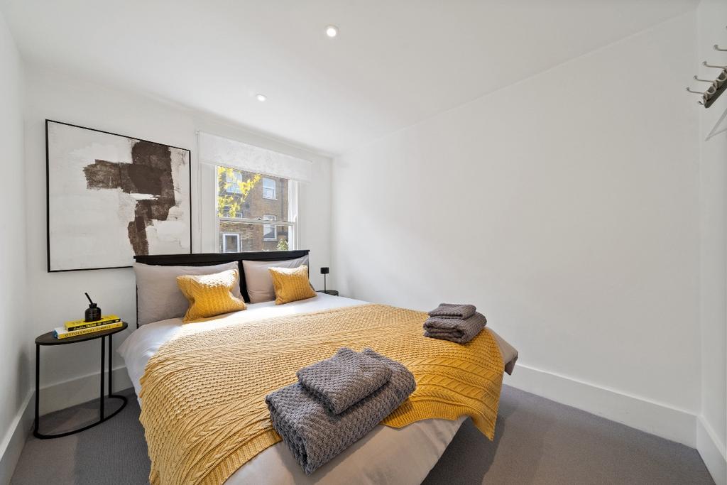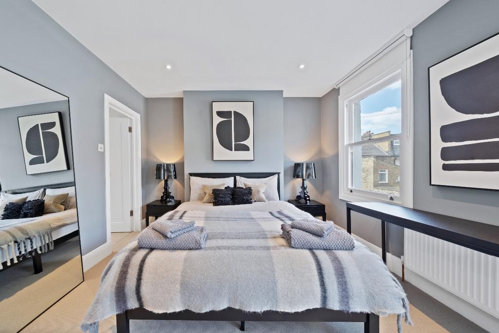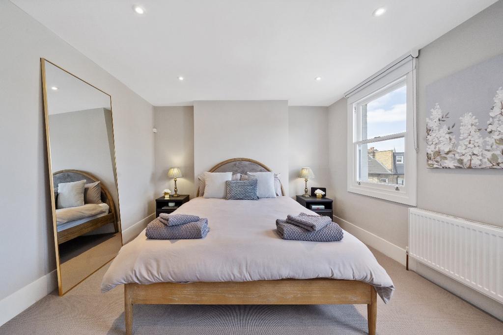 The bedroom on the first half landing offers garden aspect and is furnished with a UK King bed. This bedroom can be changed into an office or nursery or dressing room, if required.
