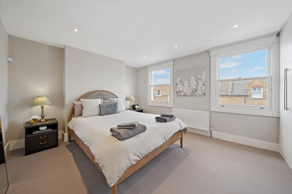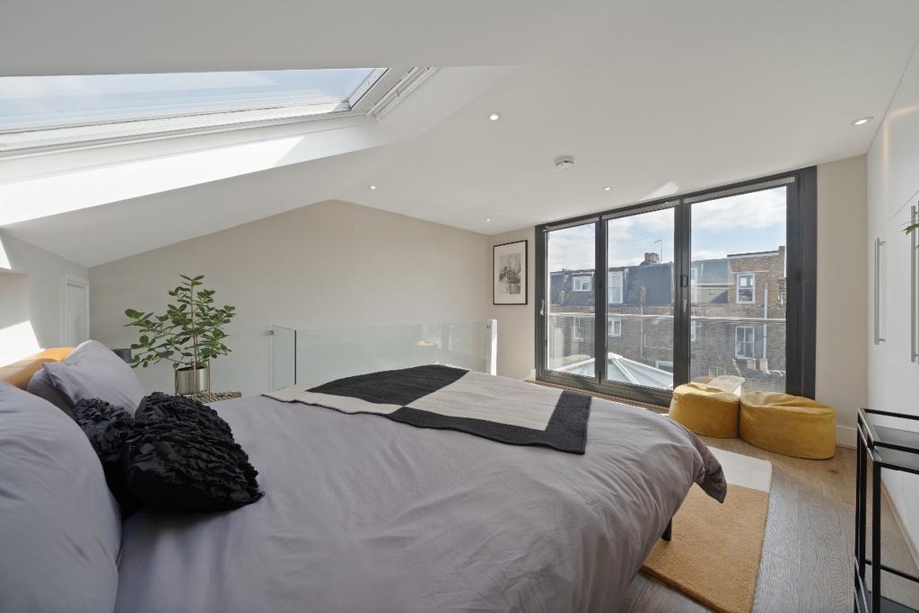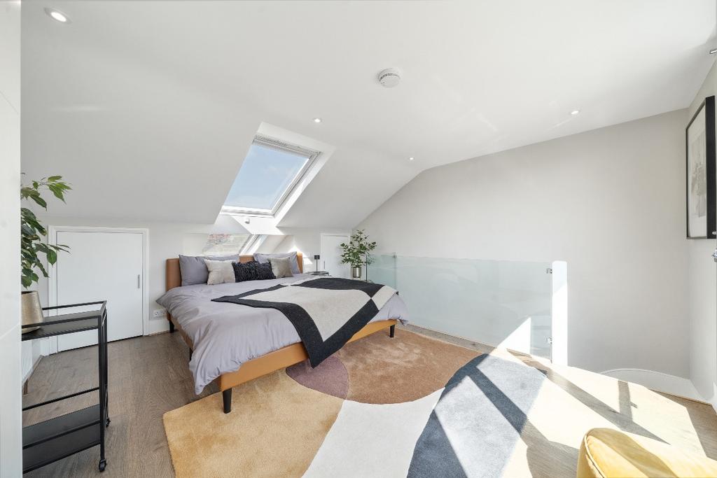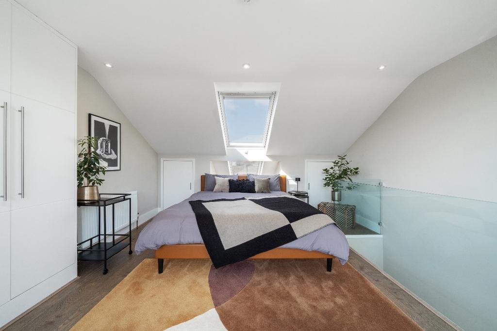 The generous loft space is furnished as the fourth bedroom with a UK Super King Bed, wardrobes, Velux windows and a large french window offering south garden aspect.