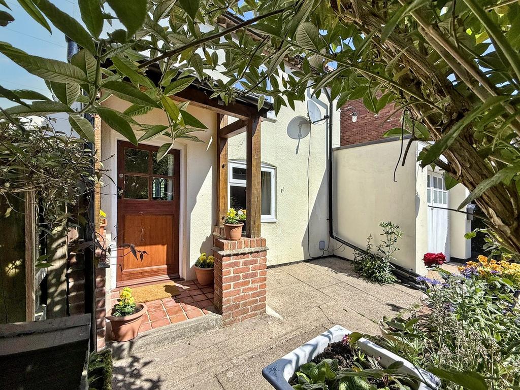 Exterior - The property features a driveway with space for two vehicles and access to the garage. The front garden is a manageable cottage-style space with a lawn and plant borders. Side access leads to the rear garden, which offers a well-maintained lawn, patio area, and additional plant borders, perfect for outdoor enjoyment. A handy side outbuilding provides storage for garden tools or logs.