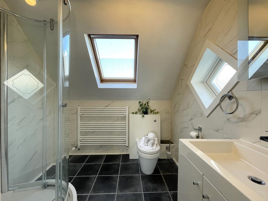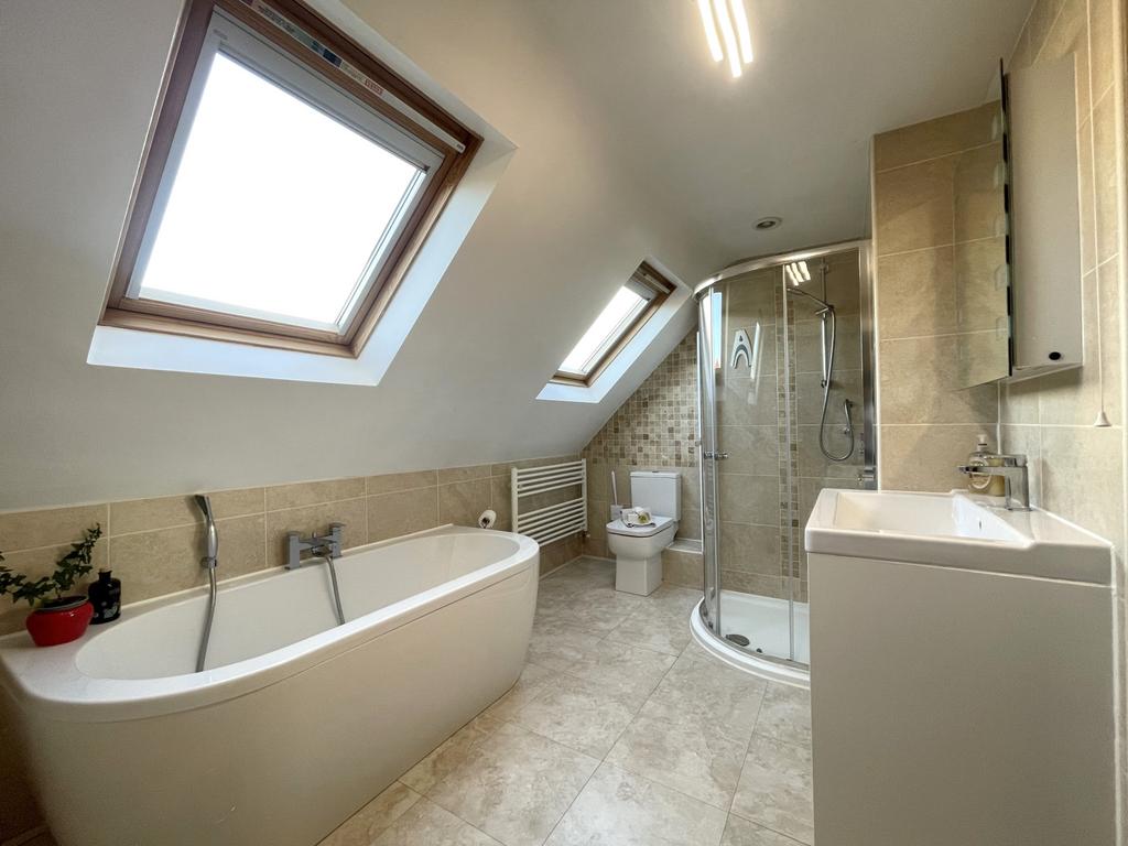 Double glazed velux windows, ceiling light point, vanity wash hand basin, low level WC, panelled bath, shower cubicle with overhead shower, heated towel rail, tiled walls and tile effect laminate flooring.