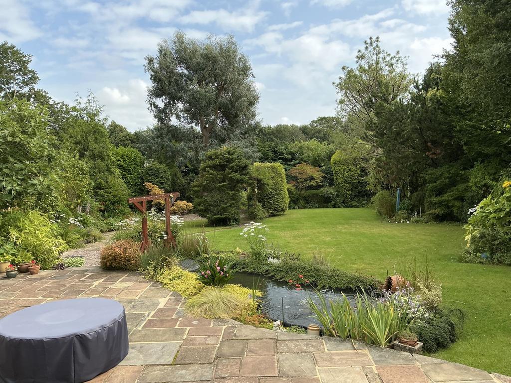 Both the kitchen doors and the office doors open to a full width decking with steps down to a large patio area and the south facing rear garden which largely laid to lawn. A number of mature trees and shrubs line both sides of the garden as well as paved walking areas.