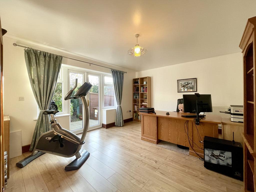 Double glazed patio doors, glazed windows,ceiling light point, radiators and wood affect flooring.