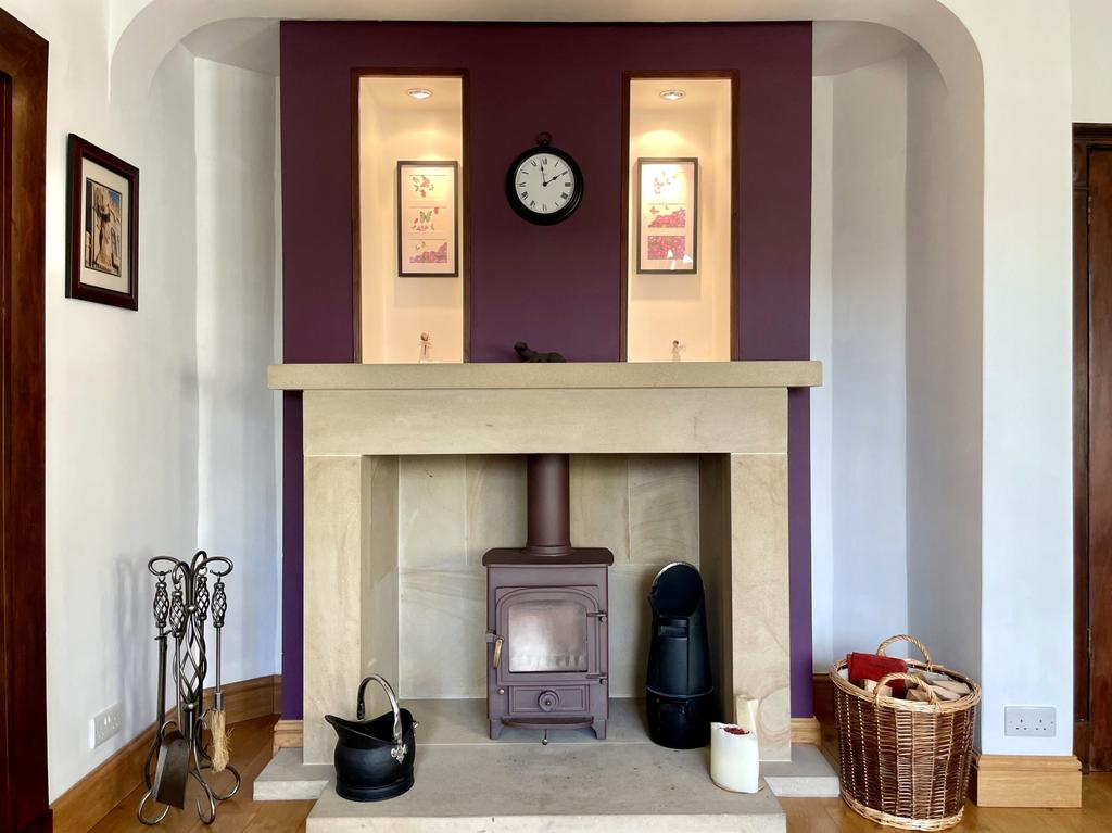 Double glazed bay window, ceiling light point, feature fireplace with duel fuel log burner, radiator and solid oak flooring.