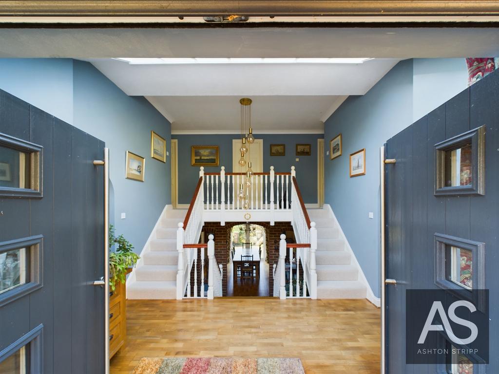 Enter through double doors into a striking hallway with a double-sided staircase to the upper floor and a staircase to the lower floor. The wooden flooring complements the row of roof lights with electric blinds, creating a bright, inviting space.